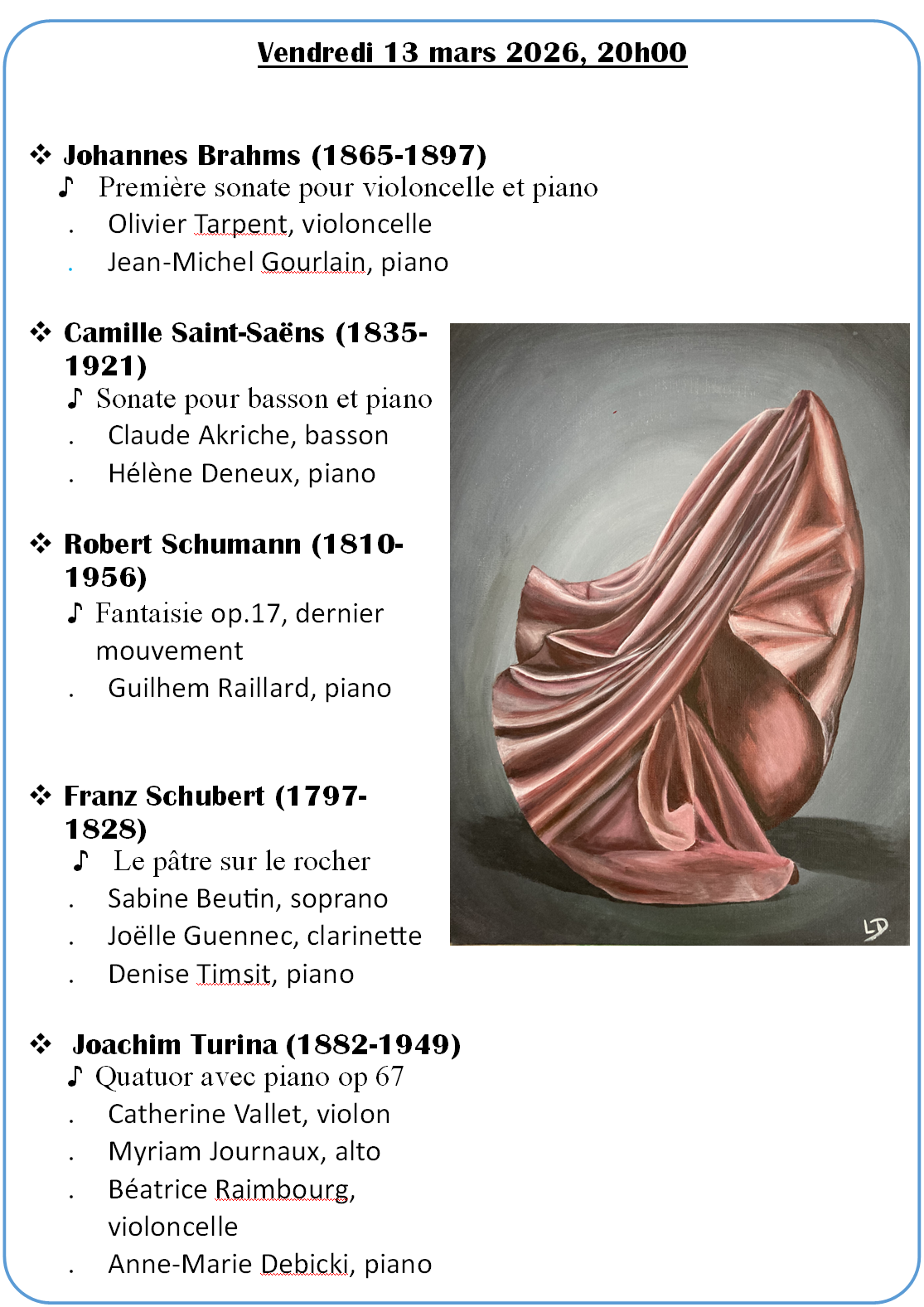 Clarinette, violoncelle, basson, chant, quatuor avec piano : une belle variété de sons et de styles pour ce concert réunissant des musiques française, allemande et espagnole : voir programme détaillé dans le document joint.
