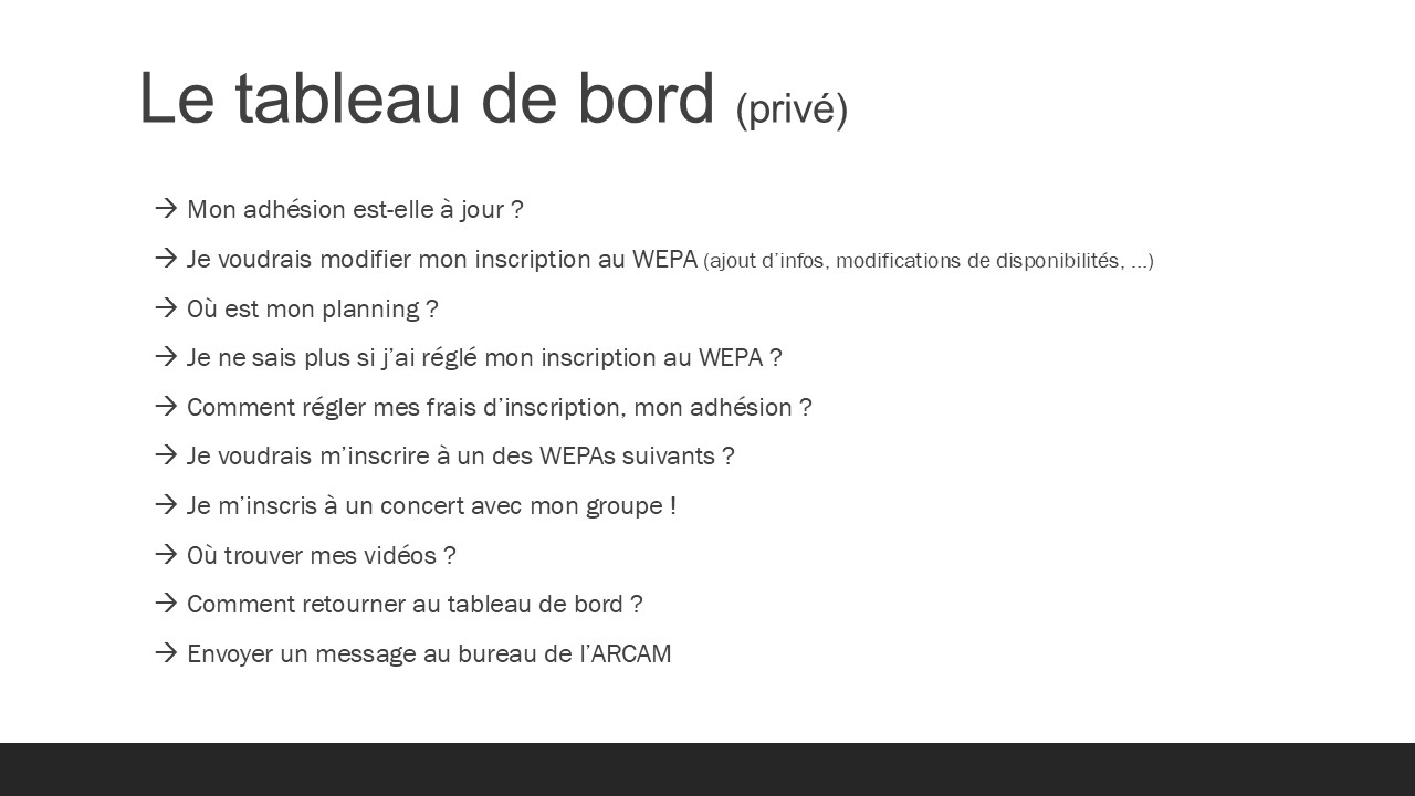 Ce service en ligne, réservé aux personnes qui ont ouvert un compte sur le présent site, permet d’avoir accès à toutes les informations utiles, participations aux WEPAs, aux concerts, données personnelles, situation financière, etc....